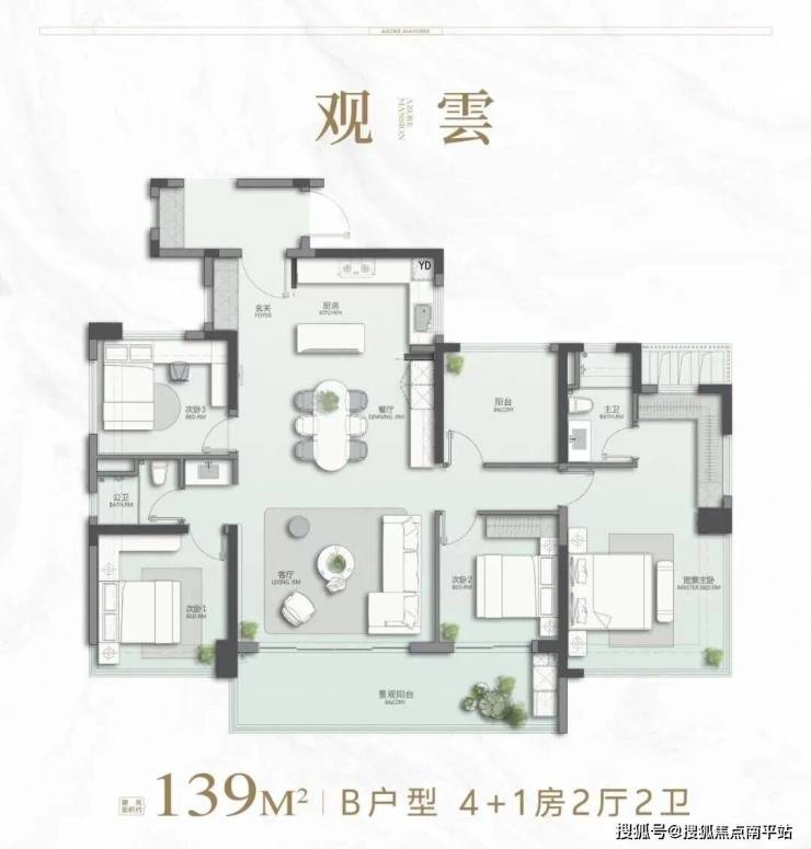 作为项目起步户型——123㎡,为四房两厅两卫设计,使用率高达112%,奢阔尺度可媲美市面上140㎡以上户型,以南北双阳台、LDKG一体化、环幕主卧带270°全景落地窗、卧室平权为特色。
