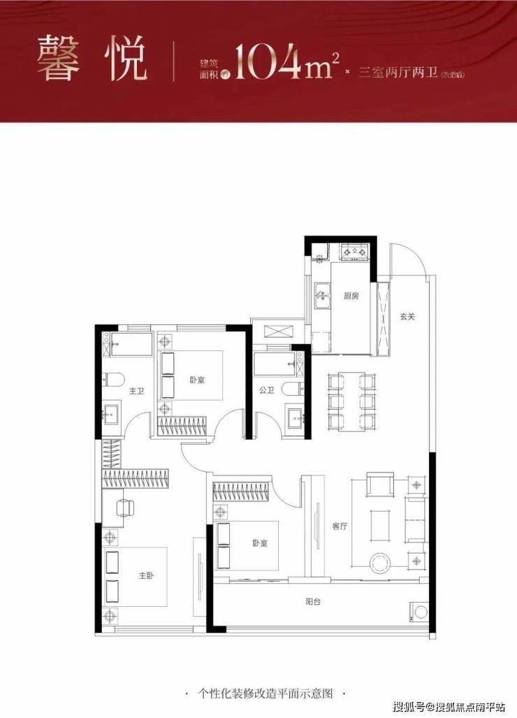 ↓这款约104㎡新规三房,主卧面积达到约26平米,南向阳台开间约6.8米,可改造为大横厅,享阔绰空间及充足采光。