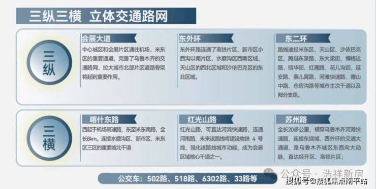 畅享三纵(河滩快速路、会展大道、东二环)三横(喀什东路、红光山路、苏州路外环)组成乌鲁木齐快速路黄金路网,BRT6号线、地铁4号线(在建)、1路/532路/78路等数10条公交路线,15分钟通达全城。