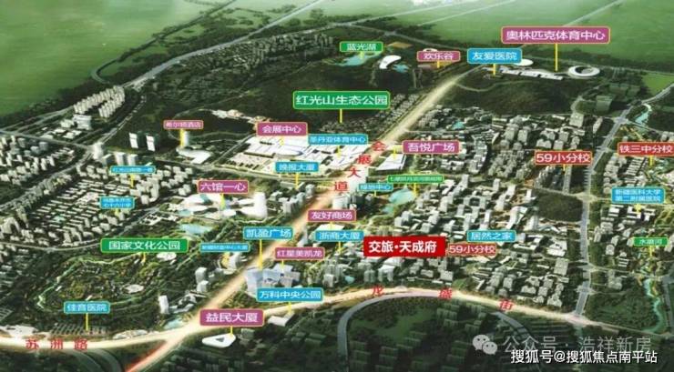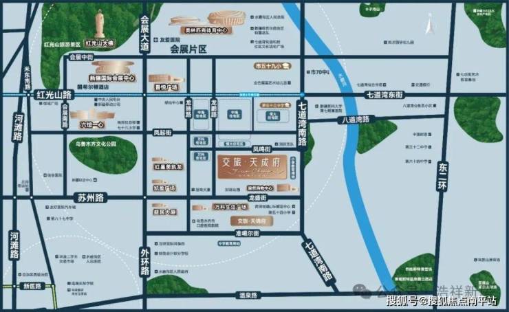 交旅·天成府与水磨沟区排名第一的59小会展中心校区一路之隔(在建)。