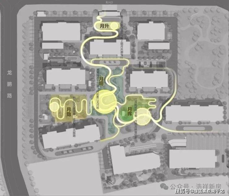 小区的入口空间以一面月亮的镂空景墙作为中心对景,景观叠水台,搭配雾森装置、琉璃置石和仙鹤雕塑,打造出一幅“海上升明月”的风水布景。