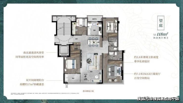 建面约118平的洋房,改造性很强,可以做三房,享受7.2米的大横厅,也可以改造成四房,四叶草的设计,几乎没有过道,利用率更高。即使是四房,空间感也很强。