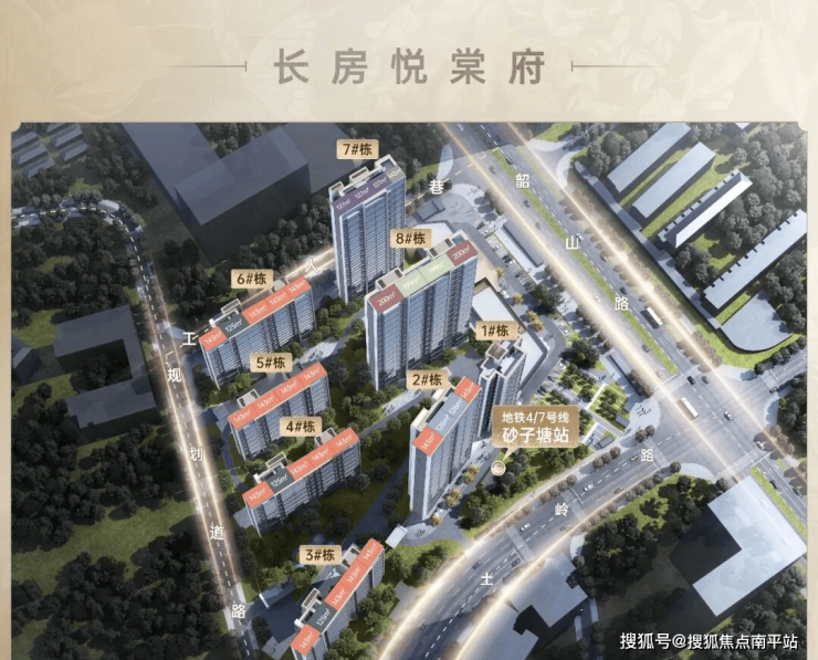 方圆900米范围内,坐拥韶山路、芙蓉路双干道,更拥揽地铁1号线、3号线、4号线、7号线(在建,预计2027年建成通车),傲立地铁4/7号线砂子塘上盖,通行全城无碍,纵观长沙,止此悦棠府。