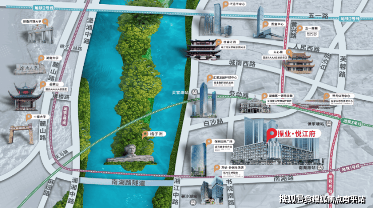城市依水而兴,人类逐水而迁,湘江涵养诸多历史人物,湘江东岸更堪称豪宅聚集区。步行约5分钟即达湘江风光带,与橘子洲头、岳麓山隔江相望,江上风光与城市高端生活气质尽显。