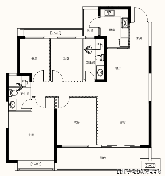 其中,建面约135-140㎡为四房设计,三开间朝南,约7.4米景观阳台,户型周正但略常规。