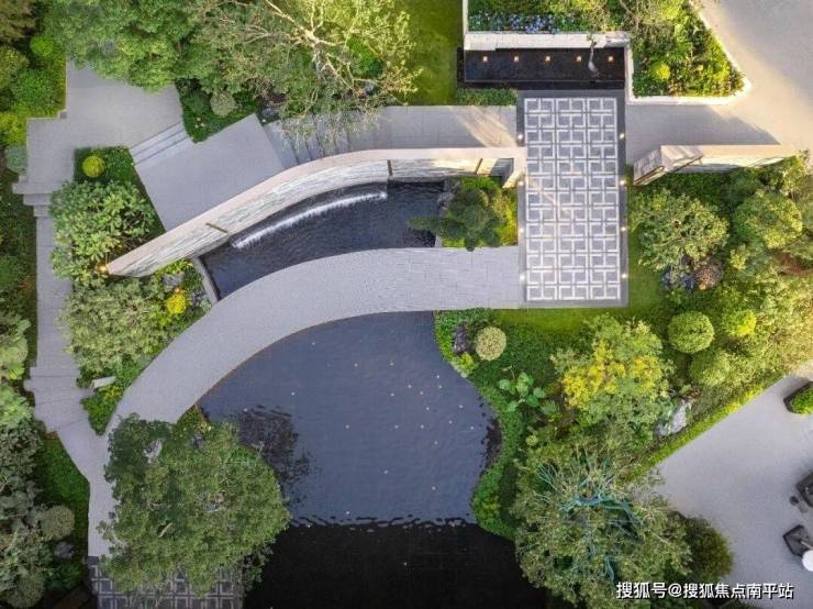 沿着归家动线往里走,大面落地玻璃框住的主水景里,轻盈小桥与石材景墙相映成趣,绿植与流水交融形成沉浸式景观,移步换景间,仿佛置身于滨海度假公园。