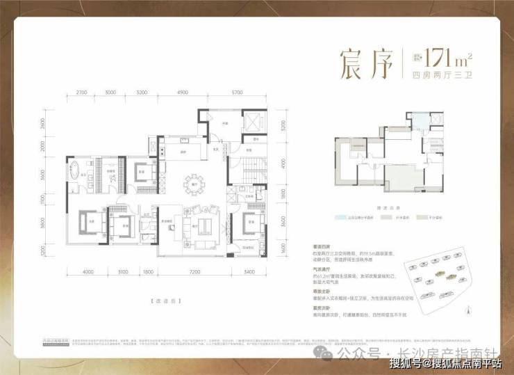 171㎡五房,南向面宽超14米,客厅7.2米大横厅,加电梯厅后得房率116%,实际使用面积达197㎡,比市面上同面积段户型多出20㎡!