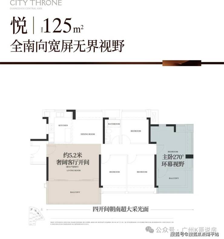 其三,270°飘窗+约8.4米南向巨幕阳台+双南向套房,户型很惊艳这个户型,四开间朝南,也是改善客户的首选。