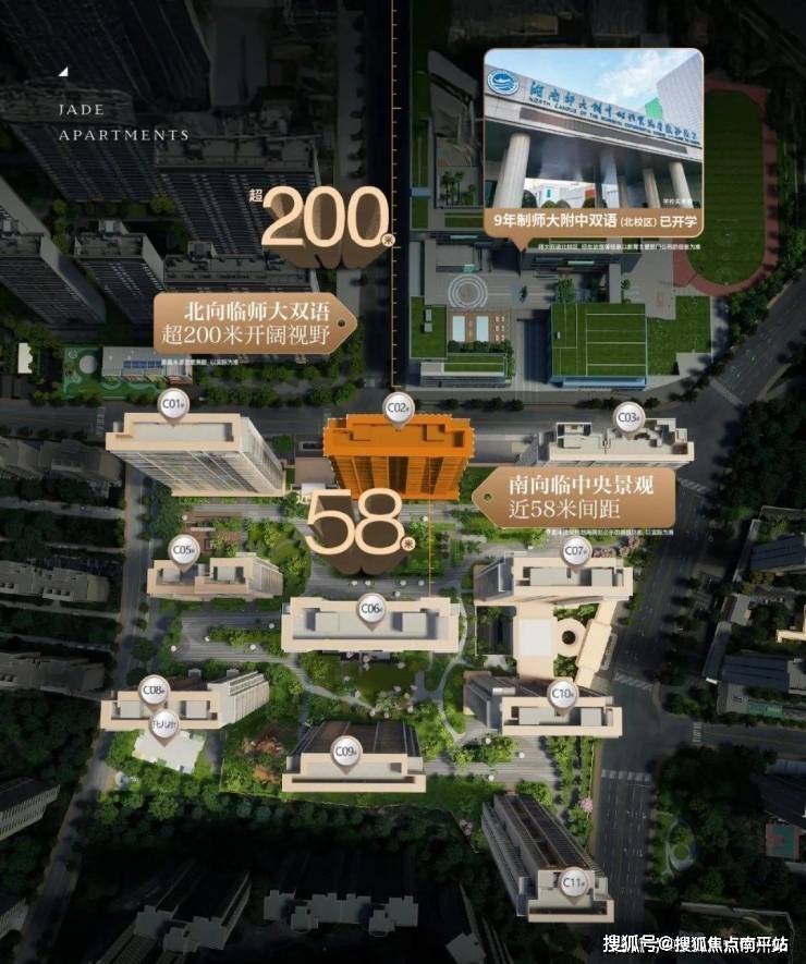 超阔楼间距,正望“庭影书意”景观组团,俯瞰水景、廊架、阳光草坪;北向与师大双语学校北校区仅一街之隔,俯揽校园风光,高楼层超200米视野,让操场上孩子奔跑雀跃的身影,成为家中风景。(师大附中双语北校区,招生政策等信息以教育主管部门信息为准;距离来源高德测距,以实际为准)