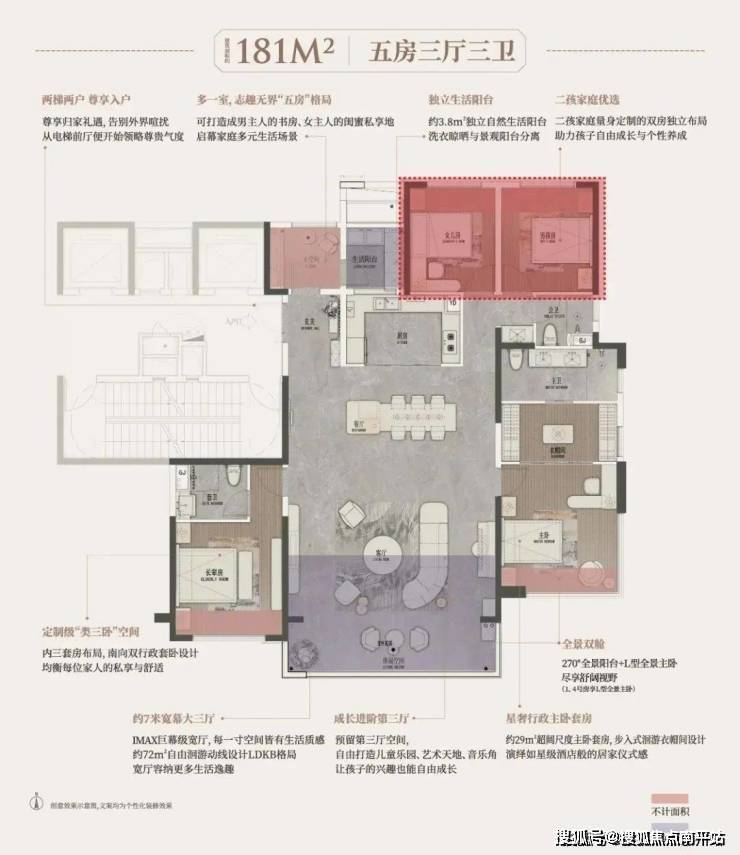 长沙润府历时一年重磅打造建面约181㎡央景宽幕大平层,在整个大盘的3000多户里,本次加推的建面约181㎡户型配比不到1/20,对比市面同等面积段的产品,能做到五房三厅、南向58米楼距、全景阳台主卧、二孩平权房、志趣第五房等诸多创新设计,可谓全市罕有。
