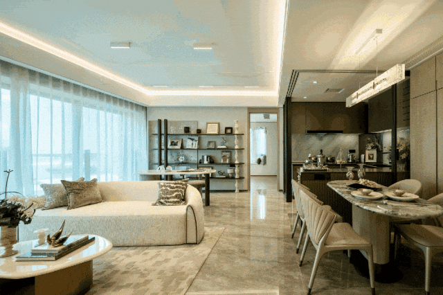 餐客厨一体化设计, 实现约40㎡超尺度公区 ,打破空间的局限性,让烹饪、用餐、娱乐等功能融合,每个场景都能亲密互动。