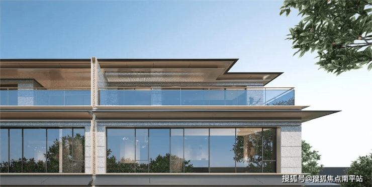 别墅区建筑不仅选用大面积干挂石材与玻璃铝板结合的立面,还设计了“重檐”元素的东方气质,“线框造型” 强化别墅横向线条的大气磅礴之势。