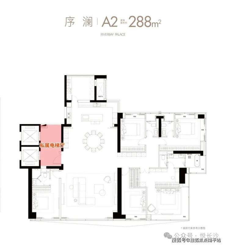 以建面约288㎡户型为例, 私享电梯入户厅,候梯效率提升;新规后使用率约93%(含飘窗/阳台)、拓展电梯前厅后使用率可达约98%。