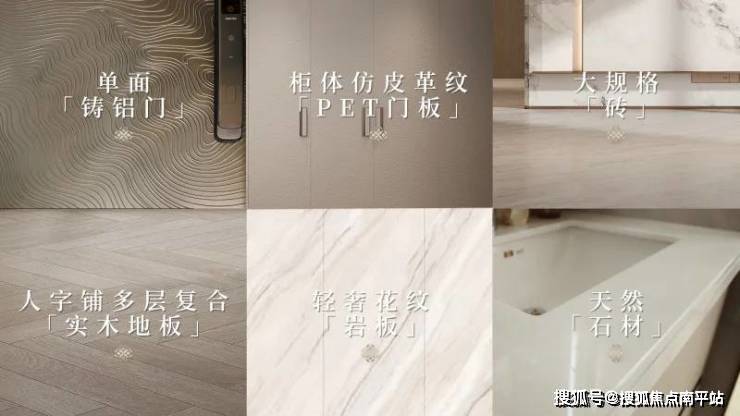 ②匠心用料搭配。高端单面铸铝入户门与仿皮革纹门板,入户玄关口搭配精美拼花纹岩板地面,彰显品位;客厅采用清新精致的芬迪白背景墙;主卫背景墙面采用白金沙,公卫主背景墙面采用卡拉卡塔金奢石岩板,均呈现出高端雅致的设计感。