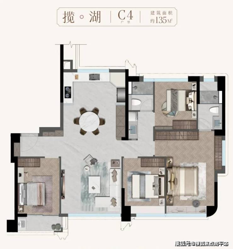135平4房2卫户型,2梯2户,备享尊贵;南北通透,三面采光,南向约12.9米四开间; 约35m²的LDK三合一大厅,南北约4米宽大平层级厨房和餐厅,空间非常宽敞;行政级主卧三面采光, 拥享双面超大衣柜空间。