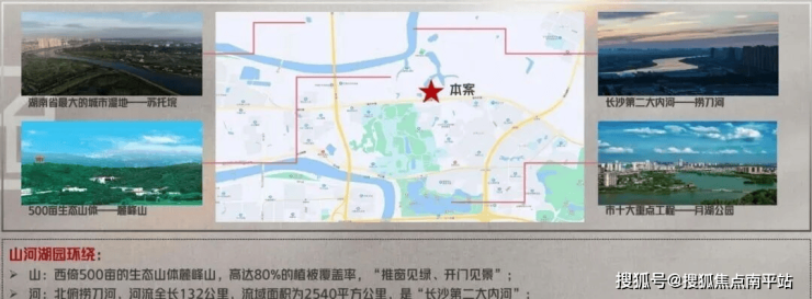 北靠捞刀河风光带、南临长沙大学及1003亩的月湖公园、西倚500亩生态山体麓峰山,依山傍水,独享生态谧境,城市级私享山河湖园景观,繁华都市里的静谧”桃花源“。