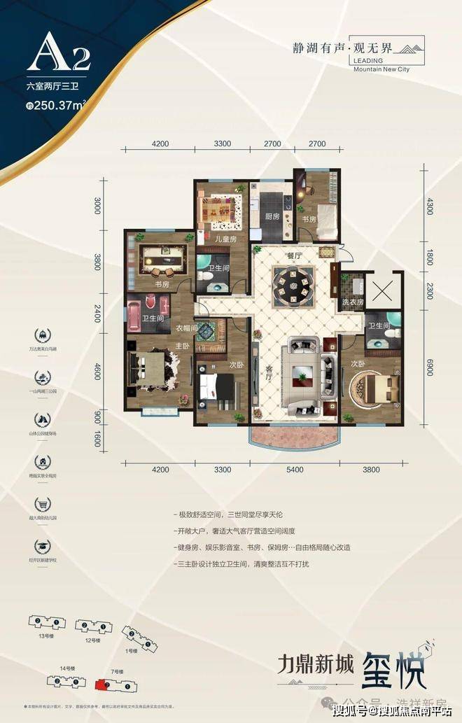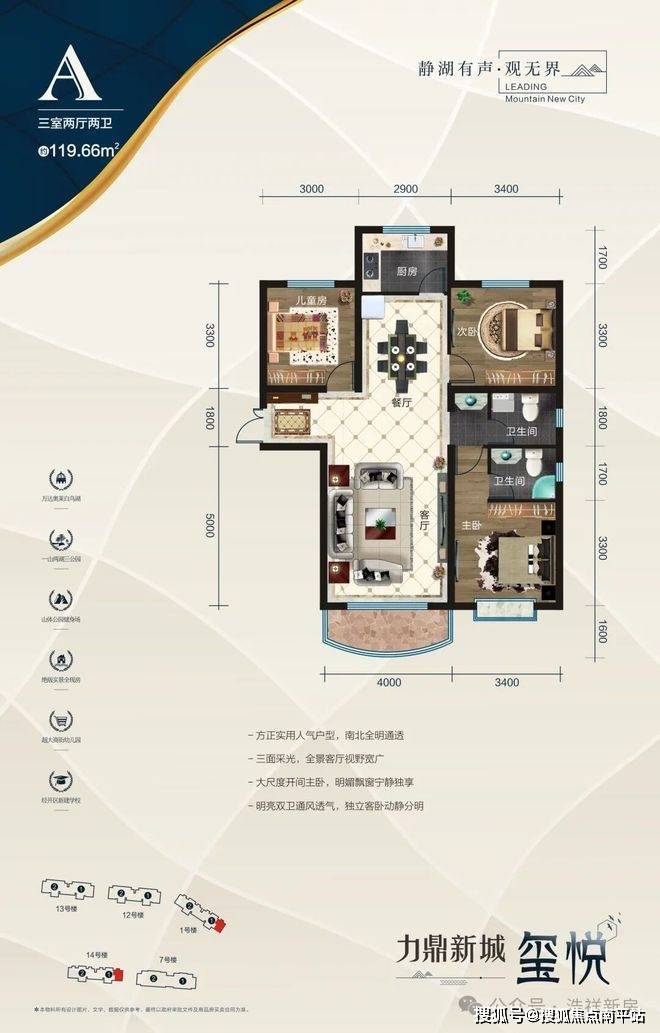 主力户型:100㎡(3室2厅1卫)、120㎡(3室2厅2卫)
