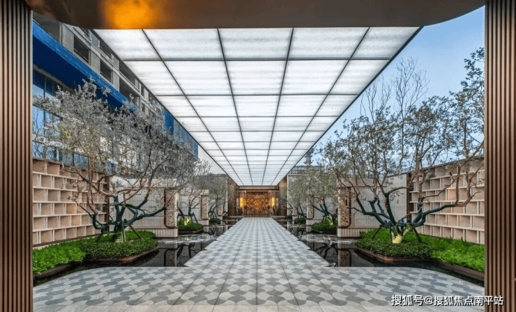 超20米纵深、4.5米净高云廊内嵌感应式涟漪系统,实现“步步生花”互动光影。地面铺陈东方瑰宝级石材,两侧配以六片精雕景墙与八棵特选油橄榄,以地中海美学融合东方礼序,营造沉浸式过渡空间。