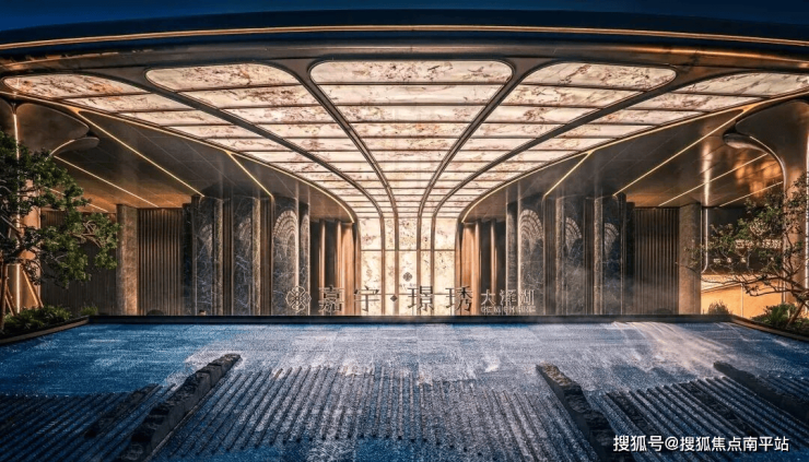 项目以近70米宽弧形顶盖、约9米挑高空间,结合景墙一体化延伸,构筑约120米的超级展示界面,远超当前市场。大门正中采用透光云石板,营造梦幻光影;前方设置“百舸争流”艺术景观,溯源湖湘,以现代手法演绎门第仪式。