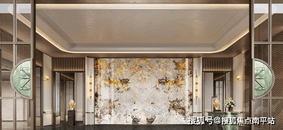 酒店式门厅选用孔雀开屏发光玉奢石背景墙,搭配绿野仙踪、太古黑金、布鲁诺灰等多类奢石,打造造价逾8000元/㎡的视觉焦点,呈现流光溢彩的归家序章。