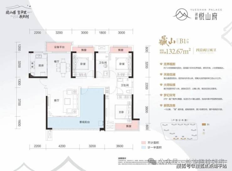 132平米南北通透双阳台约0公摊,约7.4米宽幕星光阳台,北向连线超130米无界视距,南向直面3万方七峰公园,南北通透双阳台,观百亩内外双山体,领略大自然鬼斧神工的山川之作。主卧室270°超广角梦幻飘窗