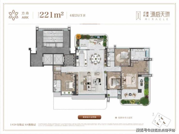建面约221㎡户型,拥有专属入户电梯前厅约6㎡,私密过渡,归家从容有序,出入高效便捷; LDKG一体化社交横厅91㎡,开阔大气,轻松容纳家庭欢聚、会客宴请等多元生活场景; 户户私配空中庭院,闲时观景小聚,尽享墅式悠然; 270°全景主卧套房,配备双台盆独立卫浴与奢阔衣帽间,尺度奢适,媲美行政套房的尊崇居住体验。