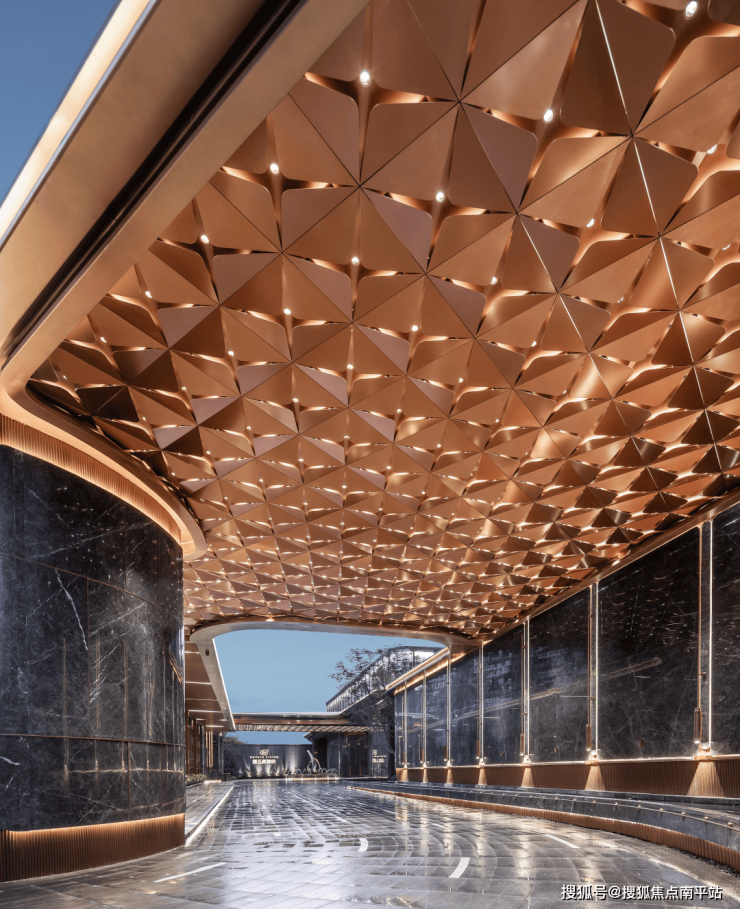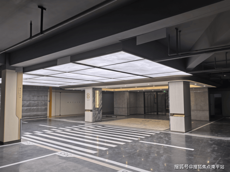 地库入口饰面装饰与线条灯带相结合、搭配极具张力的星空吊顶,告别传统“裸露水泥感”。地库管线从集中跨越车道、优化走向,避免杂乱交叉;到管线翻弯统一高度与角度,视觉上整齐有序;再到穿墙管线做装饰美化,不外露、不突兀,共同营造出明亮、整洁、优雅的地下行车与归家环境。