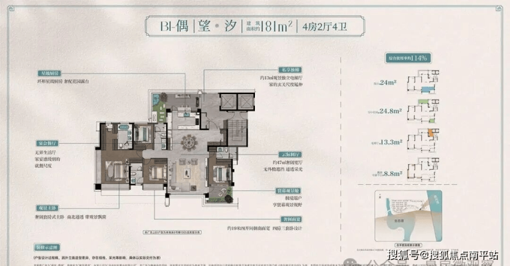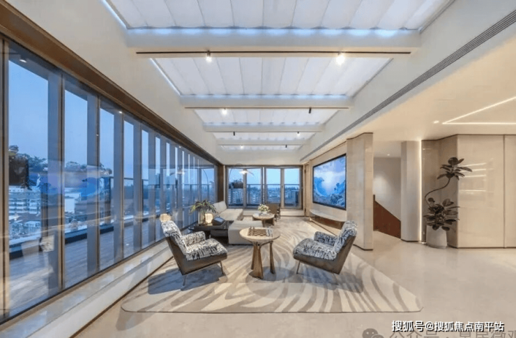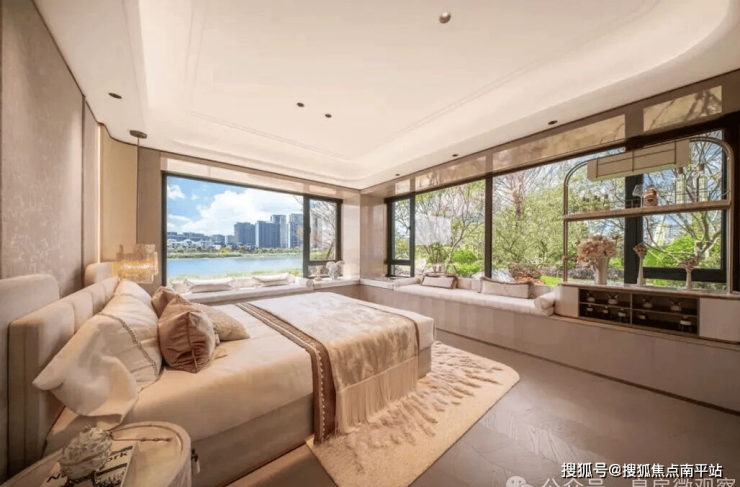 此外,约14米南向4开间面宽,室内通风采光效果优;奢阔宽厅连接南向空中庭院,三面揽景;南向双套卧设计,其中套房式主卧带观景飘窗,奢居体验感拉满。