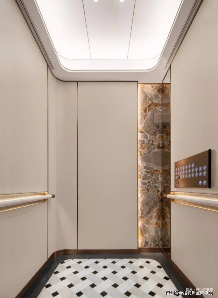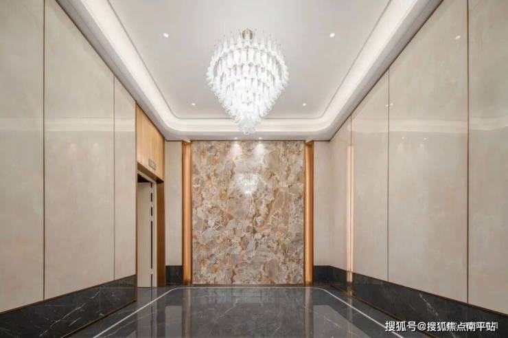 最终抵达格调梯厅,玉石岩板与序列金属造型打造出满满的仪式感,天花弧线与深色石材的层次搭配,让空间既有尊崇感又不失温情,为整场归家之旅画上圆满句号。