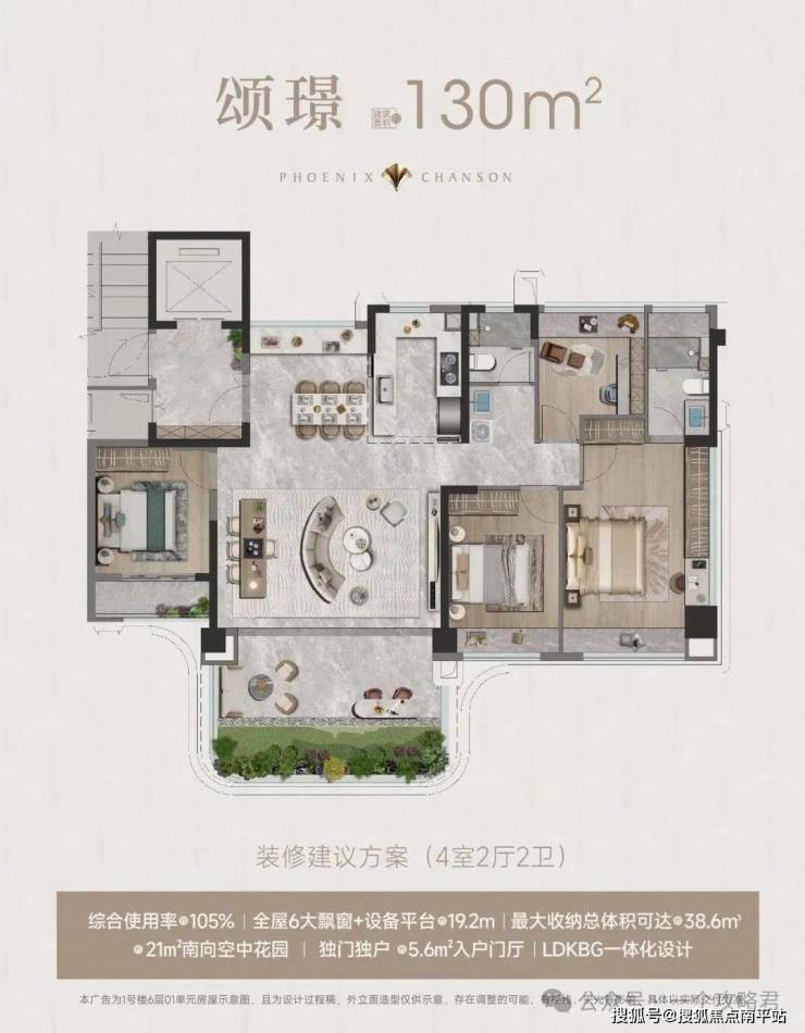 建筑面积约130㎡4房2卫,综合使用率高达105%!负公摊!独门独户,5.6平入户门厅;全屋6大飘窗+设备平台赠送约16.4㎡,最大收纳总体积可达约21㎡;22㎡南向空中花园。