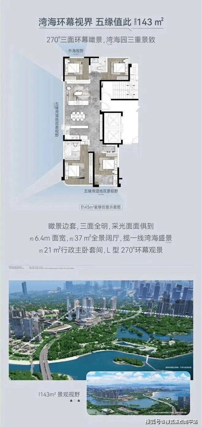 :143㎡户型有竖向通厅设计,南北通透,客餐厅分离,约 14.2 米南向湾景开间;230㎡湾海大平层户型方正南北通透,餐客双厅流线设计,有 2 米湾海宽境景观巨厅,南北双向景观视野。