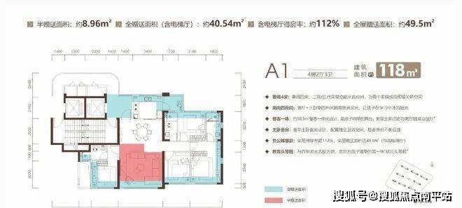 大家可以看看润和学府118平户型,含电梯厅得房率约112%,全屋赠送约49平。