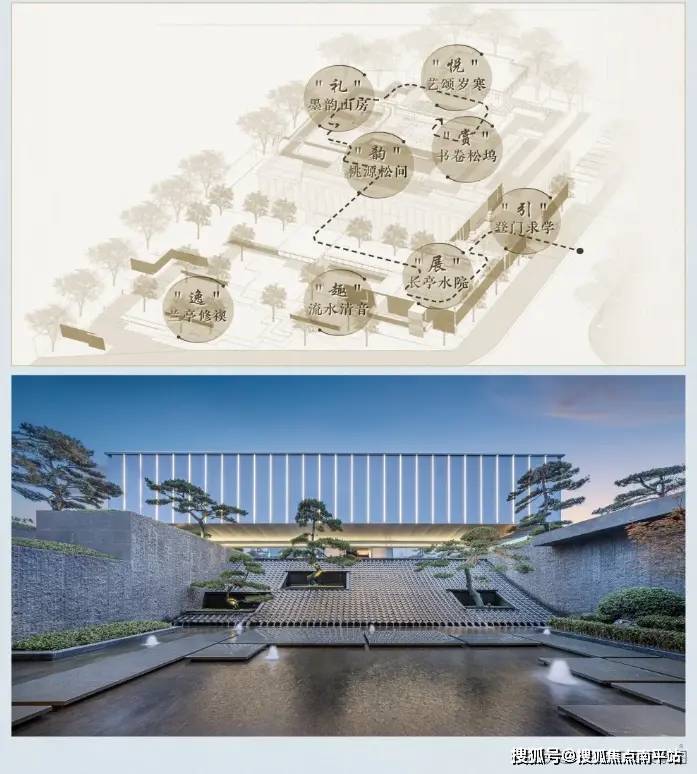 【中国铁建·花语江南】取书院文化进行空间演绎,延续「岳麓书院」礼制,以中正对称的布局与多重进制礼序,有序落位,层层递进,隐隐可见书院的庄重气脉;同时又将江南的婉约点缀其间,亭台楼阁的穿引,小桥流水、飞檐翘角、假山叠石为生活增添诗情画意的闲雅趣味,展现出以「东方意境」、「文人雅集」的现代东方美学居住体验。