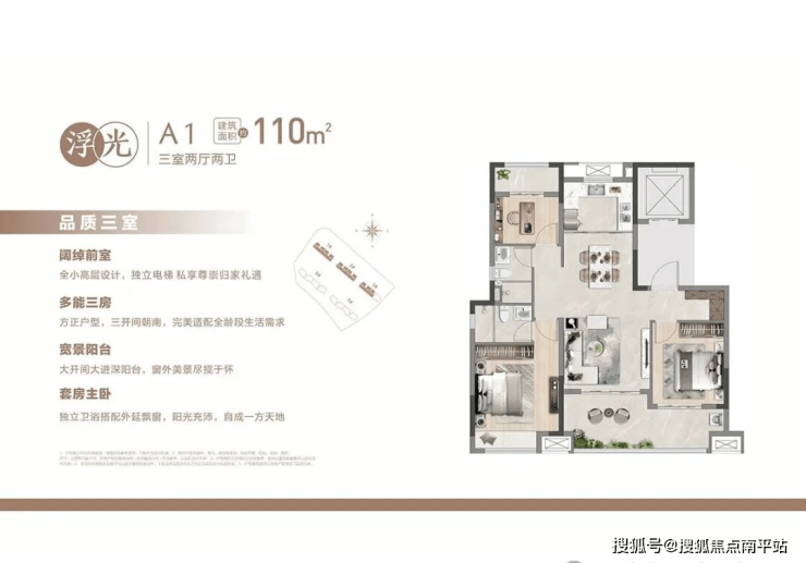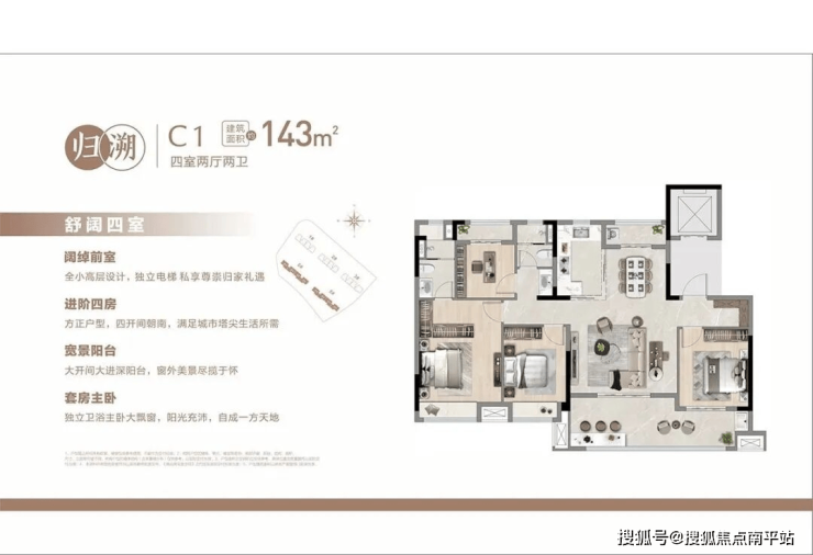 主推 110㎡三房和 143㎡四房户型,110㎡三房做到双卫设计,主卧带独立卫浴。143㎡四房设置独立家政间,主卧与次卧均带独立卫生间,动静分区合理,居住舒适度高。