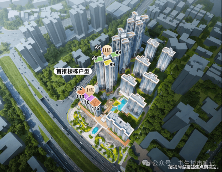 首推1栋、11栋,11栋主打小户型,即建面约89-92-99㎡三至四房,1栋小高层板楼主打改善,为建面约110-112㎡四房。