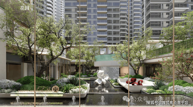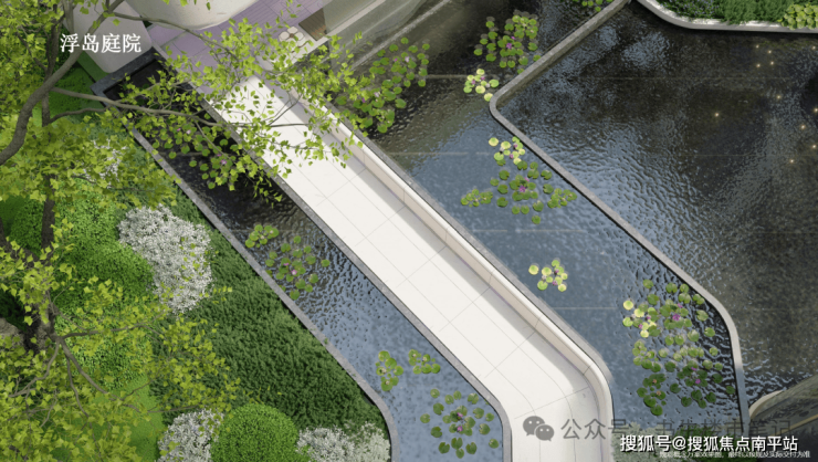 浮岛花园作为核心景观,采用“抬高式水系环绕”设计,营造悬浮在绿意里的花园。午后在这里散步、周末带娃玩耍,既有私密景观体验,又能成为社交打卡点。