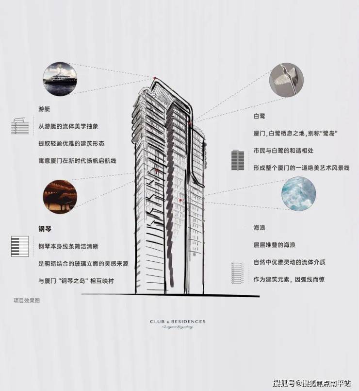 融汇白鹭、钢琴、游艇、海浪等鹭岛符号;选用大面积玻璃、铝板、涂料等材料。