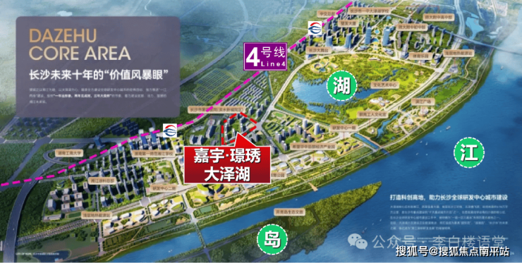 大泽湖, 有着“临江、拥湖、通地铁、揽洲岛、眺远山”的独特优势,以湘江+大湖为片区低密低容定基调,高能产业赋能量,地铁和教育增价值,最终汇总成一个词:高能。以嘉宇·璟琇大泽湖为例: