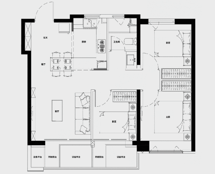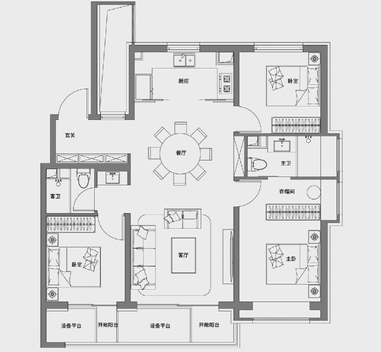 以建筑面积约128㎡三室为例,南北贯通的客、餐、厨,从户型侧面转移到中轴线上,两间南向卧室置于中轴两侧。