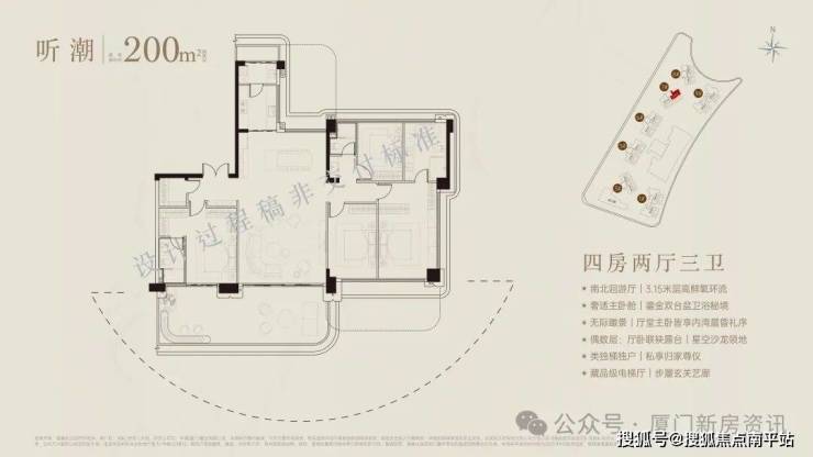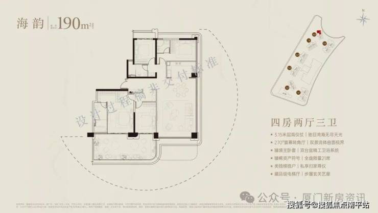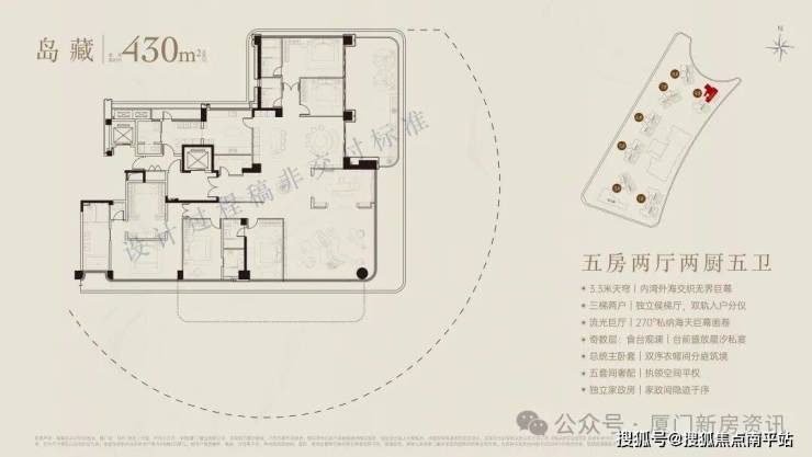 五缘湾顶豪保利安控御宸天悦拥有最佳的朝南向一线景观面,30米极致亲海、270°环幕瞰海,C形布局,户户看景,打造集稀缺湾海资源与高端人居价值于一体的瞰海第四代豪宅。面积段有188-196-235-300-348-440m²第四代豪宅,17~22层,层高3.15~3.3米。全盘仅274套,300内均价8.5,300以上9.5万。三楼以上就能看海,190平米,1100万起!