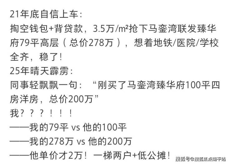 帖子里的案例是联发臻华府疯狂降价,高位时单价3.5万总价270万买了79平高层三房,现在别人单价2万总价200万出头就买到了100平洋房四房。