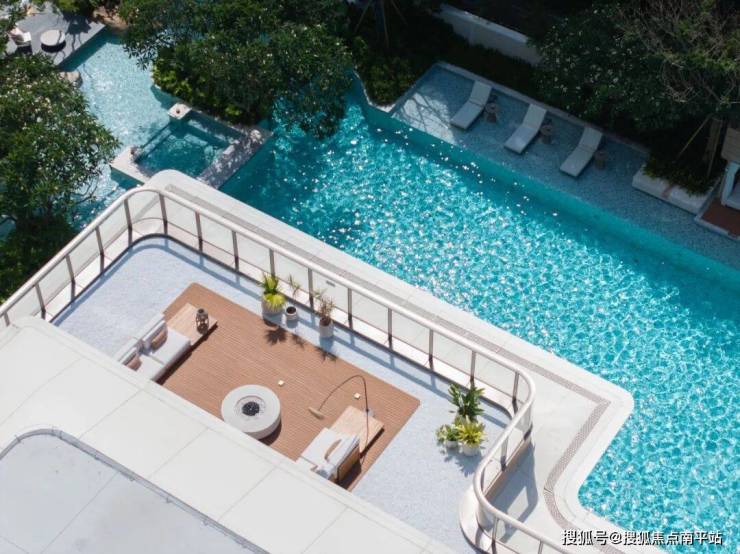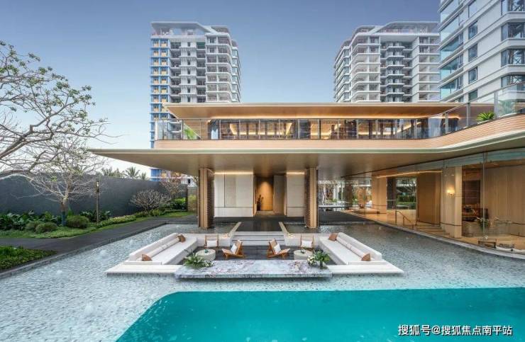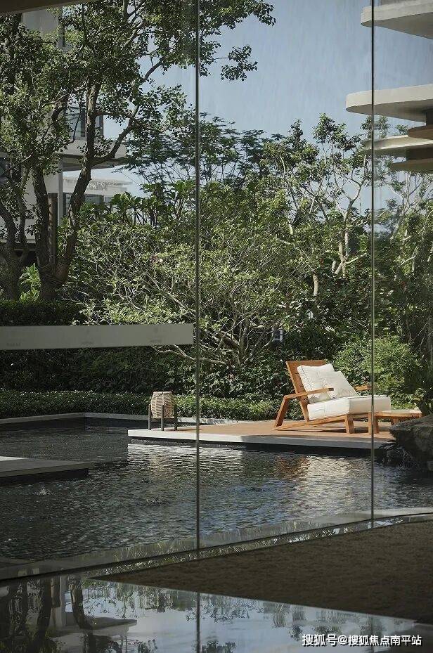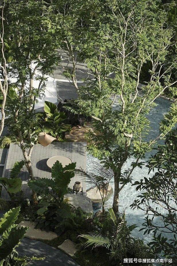 林下泳池CLUB,设置亲子按摩池与家庭泳池空间,集社交、休憩、赏景功能于一体;池畔廊亭与休闲卡座掩映于葱郁热带林木之间;潺潺流水与上百种热带植物交织成度假的松弛乐章。