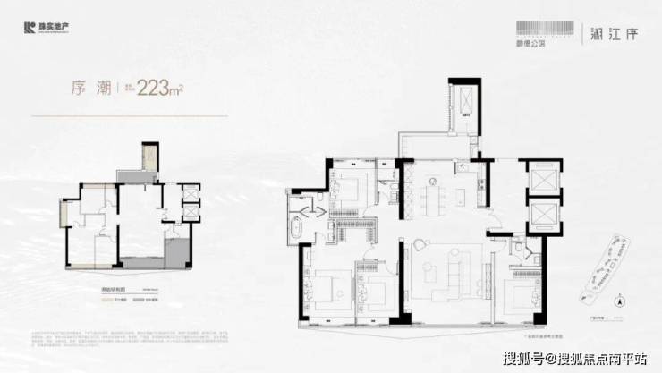 建筑面积约223㎡户型,辽阔总面宽、南向四开间、三面采光、主卧度假级套房、LDKB一体化设计等,雅契栋梁品位。