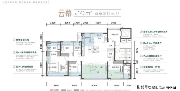 143㎡户型,四房三明卫,面宽19.2米,主卧跟市面上同面积户型的客厅差不多大,尺度媲美180㎡,得房率约112%。