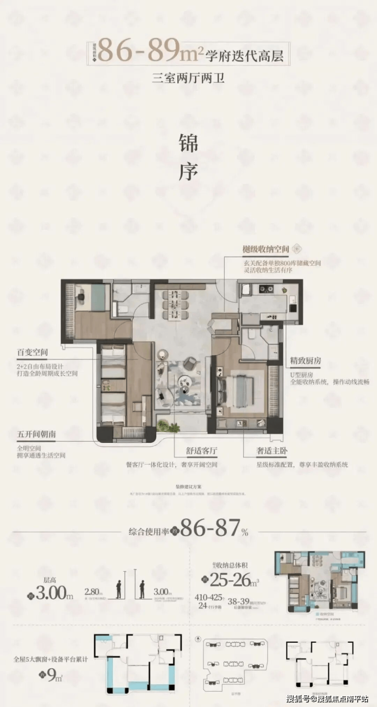 31至33层高层产品涵盖88-111平三至四房,占比60%、17层洋房产品涵盖86-110三至四房产品,占比18%、四代洋房产品涵盖132-139平四房,占比22%。
