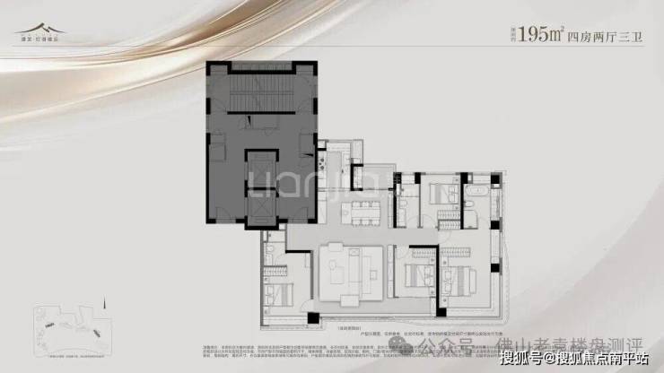 195㎡四房两厅三卫:项目核心主力户型,17 米南向瞰江面宽,约 60㎡LDKB 一体化方厅,270° 寰江主卧套房,所有次卧均可看江