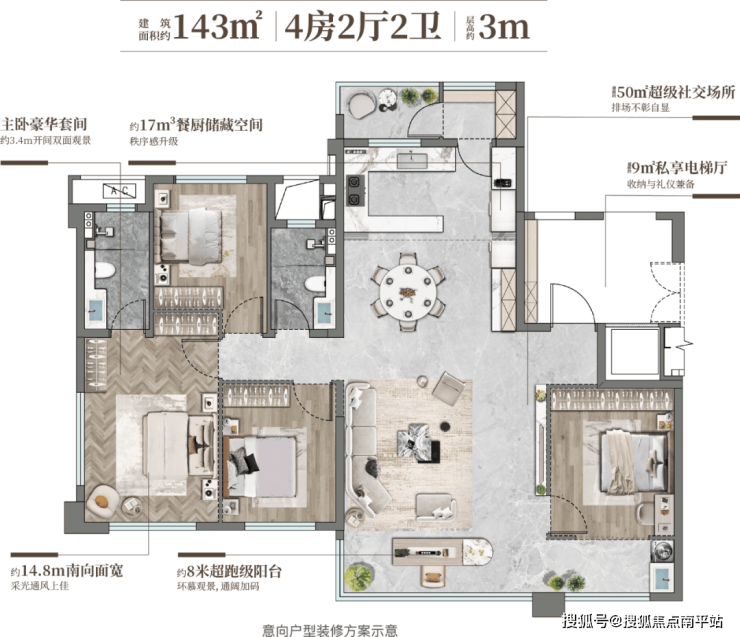 (3)建面约143㎡越级改善大四房,让奢享融入日常,定义高端人居标准: