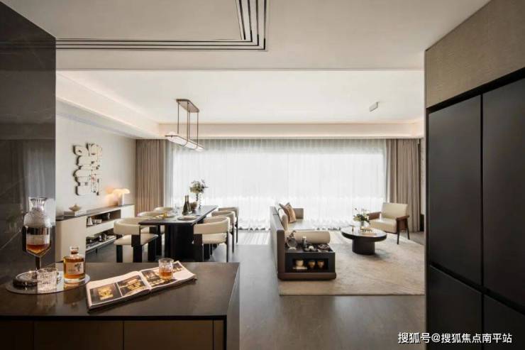 一体化布局,让妻子准备晚餐、丈夫在客厅阅读、孩子在一旁写作业的场景同框呈现,容纳全家的点滴温馨。