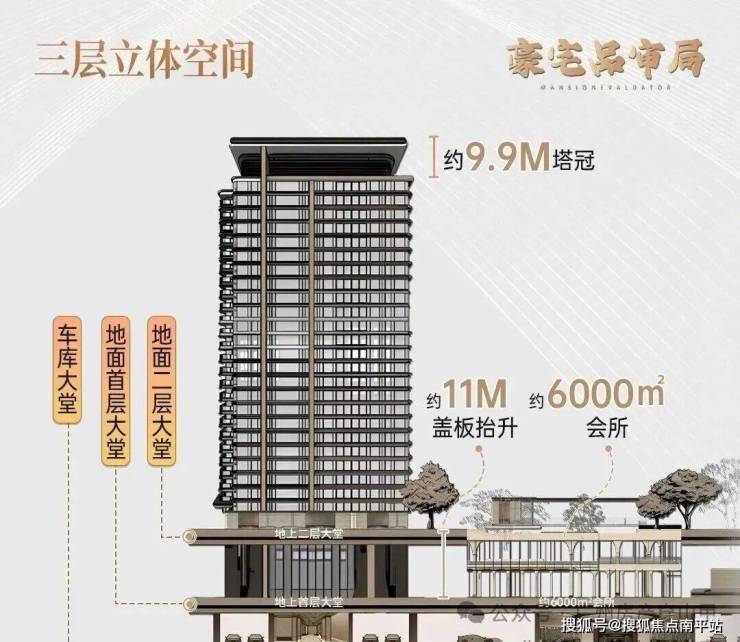 湾流曲线的幕墙体系,9.9米尊玺塔冠,还有一座全市首创,挑高达11米的城市浮岛。