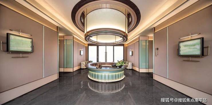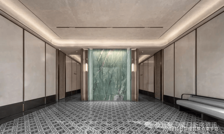 1、首层门厅及地下室门厅,同样高配精装标准,均选用造价昂贵的翡翠绿奢石做背景墙,采用定制弧边工艺,其余墙面仿玉石岩板。